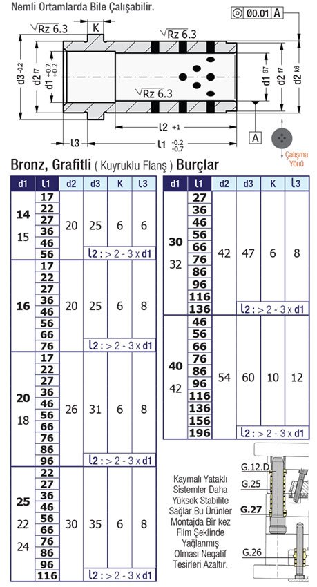 Kendinden Yağlamalı Grafitli Burçlar : Enjeksiyon Kalıplarında G.13D Yağlama Kanalsız Kolonlar ile Birlikte Kullanılır. Kalıbın Boy Olarak Merkezlenmesiyle Daha Yüksek Stabilite Sağlanır. Bu Şekilde Diğer Ekipmanlarla ( İtici - Maça vb. ) Hassas ve Uzun Süreli Çalışma Ortamı Sağlanmış Olur, Kolon Burç Çalışma Sistemlerinde H7 Tolerans Önerilir.